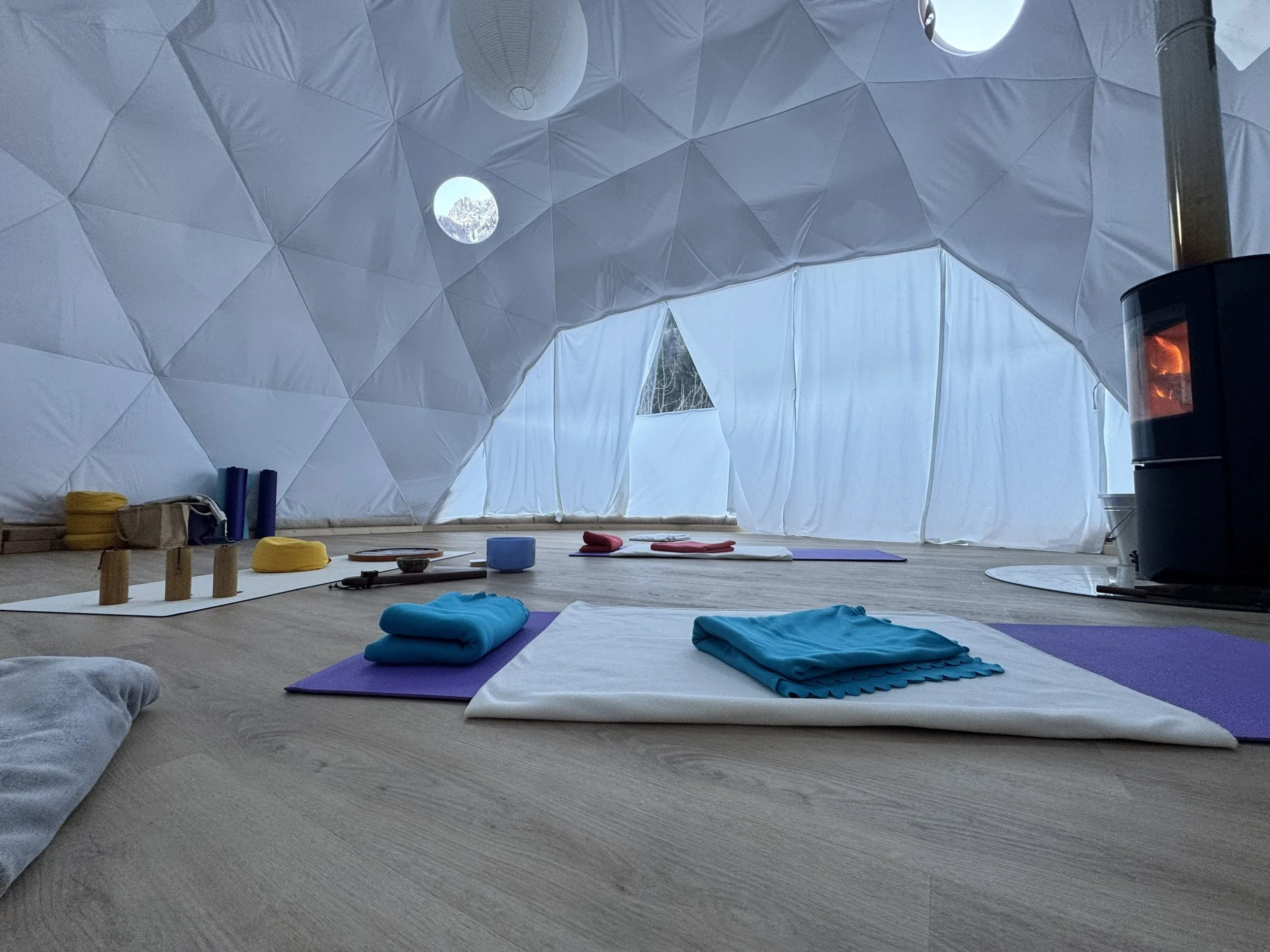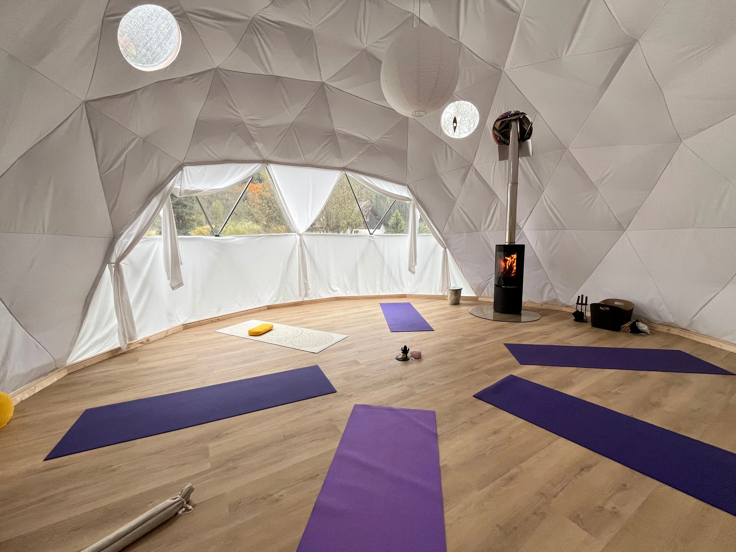 Der Dome ist mit dem üblichen Yogamaterial (Matten, Sitzkissen, Decken, Korkblöcke) ausgestattet und steht dir während der Yogalektion zur Verfügung. Die Reinigung der Yogamatten erfolgt durch die Kursleitung vor der Lektion.